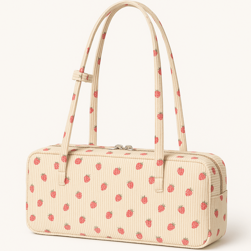 Selected cotton corduroy fabric with fashionable printed design showcasing young trendy style. Unique baguette shape highlights personal taste, perfect choice for fashion-pursuing young women.