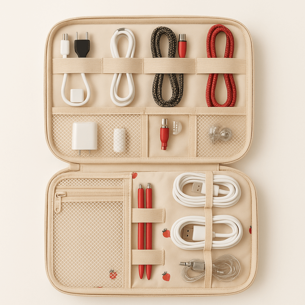 Selected cotton corduroy fabric with fashionable printed design showcasing young trendy style. Professional compartment design keeps data cables organized, ideal choice for young people pursuing both fashion and practicality.