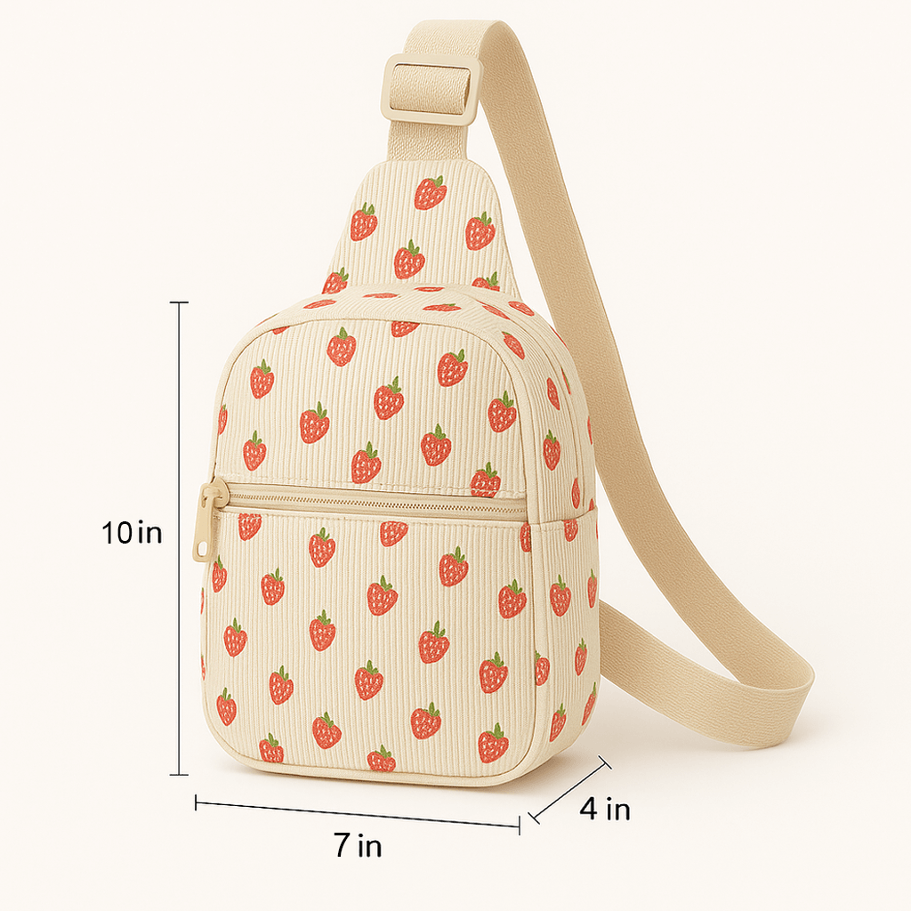 This vibrant cotton corduroy printed chest bag is designed for modern young women who pursue free and easy lifestyle. Using lightweight and breathable cotton corduroy fabric, it not only feels comfortable and soft but also provides excellent breathability and quick-dry performance, maintaining fresh comfort even during exercise or hot weather. The printed designs on the bag are full of youthful vitality and fashion elements, with bright and lively color combinations and novel unique pattern designs, perfectly interpreting young generation's pursuit of freedom, personality and fashion. The chest bag's design concept stems from modern urban life's fast-paced characteristics, hands-free carrying method allows users to enjoy life more freely. Adjustable chest strap design adapts to different body types, ensuring wearing comfort and security. Main compartment uses high-quality zip closure, safe and reliable, can accommodate phones, wallets, keys and other daily essentials. Front pocket design facilitates quick access to commonly used items, side pocket can hold water bottles or other small items. This chest bag is not only suitable for daily outings but also perfect companion for sports, travel, music festivals and various occasions. Whether cycling through city streets or hiking to explore natural scenery, this chest bag can provide convenient storage solutions for users, making every outing full of freedom and joy. It's not only a practical accessory but also an embodiment of young people's lifestyle attitude and values, showcasing new generation's pursuit of simple, practical and fashionable lifestyle.