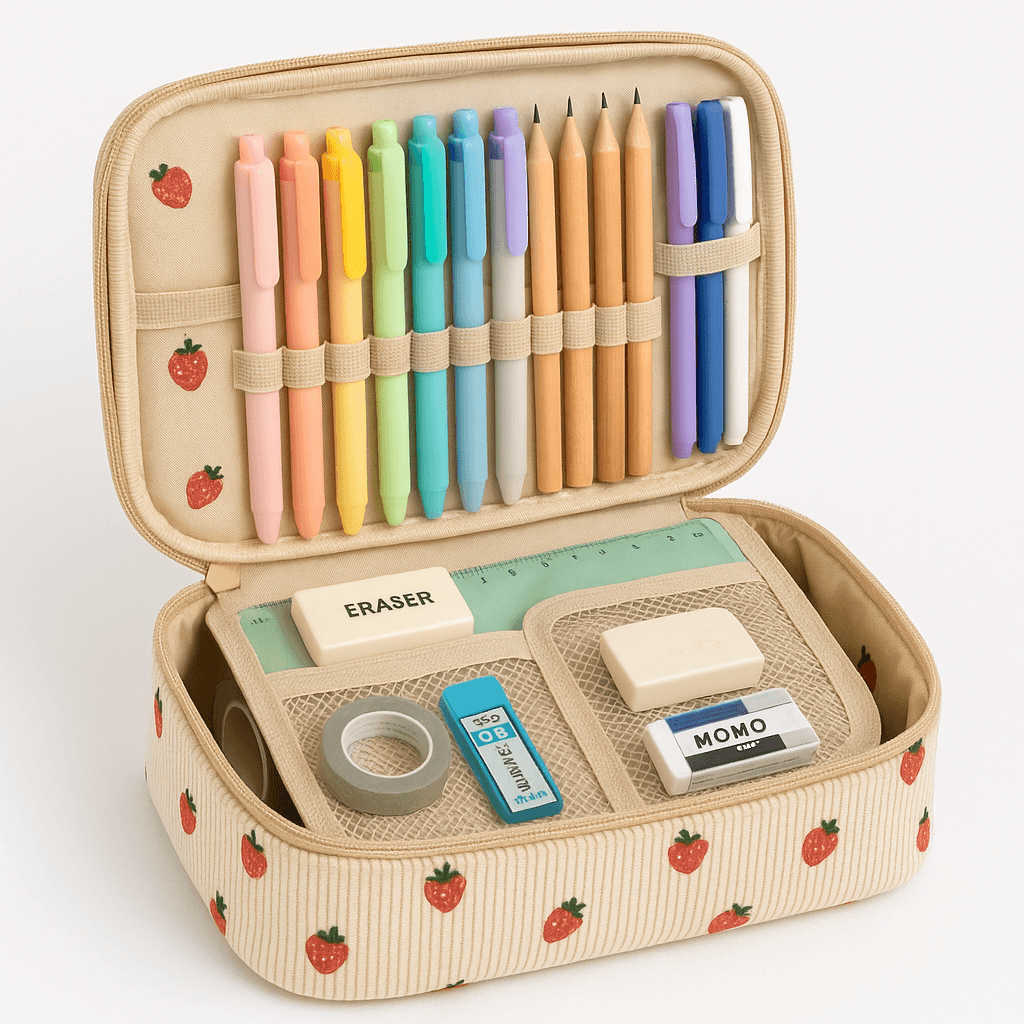 Eco-friendly cotton corduroy craftsmanship with creative printed design inspiring learning. Multi-layer storage design makes stationery organization more orderly, fashionable choice for student groups pursuing efficient learning.
