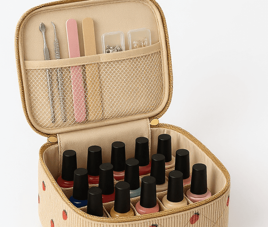 This professional and fashionable cotton corduroy printed nail art storage bag is tailored for modern women who love nail art and pursue perfect fingertip styling. Made from professional-grade cotton corduroy fabric with special stain-resistant and easy-cleaning treatment, it not only maintains fabric softness but also provides excellent durability and hygiene performance. The printed designs on the bag combine modern beauty culture with fashion trend elements, with exquisite patterns and bright colors perfectly reflecting nail art's creative spirit and fashion attitude. The storage bag interior adopts precise professional design, with 15 different-specification compartments for categorizing nail polish, nail art tools, decorations and various nail supplies, each tool having its dedicated position, avoiding collision and chaos. Custom tool position design perfectly fits various nail art tool shapes, ensuring safe fixation. Leak-proof zipper design effectively prevents accidental leakage of nail polish and other liquid products, protecting other items from contamination. Portable handle design allows nail artists and nail enthusiasts to enjoy nail art fun anytime, anywhere. This nail art storage bag is not only a professional storage solution for nail art tools but also an embodiment of nail art lifestyle, making every nail art creation full of professionalism and ritual sense.